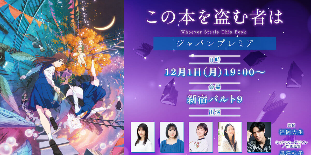 イベントでは『この本を盗む者は』が世界最速で上映される。さらに、上映前には豪華キャスト&スタッフによる舞台挨拶も開催。御倉深冬役・片岡 凜、真白役・田牧そら、御倉ひるね役・東山奈央、与謝野蛍子役・伊藤 静、春田貴文役・土屋神葉といったキャスト陣に加え、監督・福岡大生、キャラクターデザイン/作画監督・黒澤桂子が登壇する。