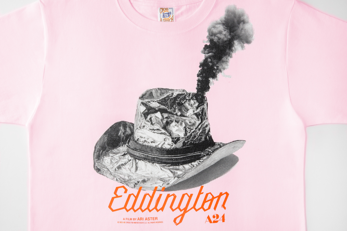 『エディントンへようこそ』のTシャツは、A24作品のクリエイティブを多数手がけてきたグラフィックデザイナーの大島依提亜がデザインを担当し、A24公認の日本オリジナルグッズとして、500枚限定で販売される。