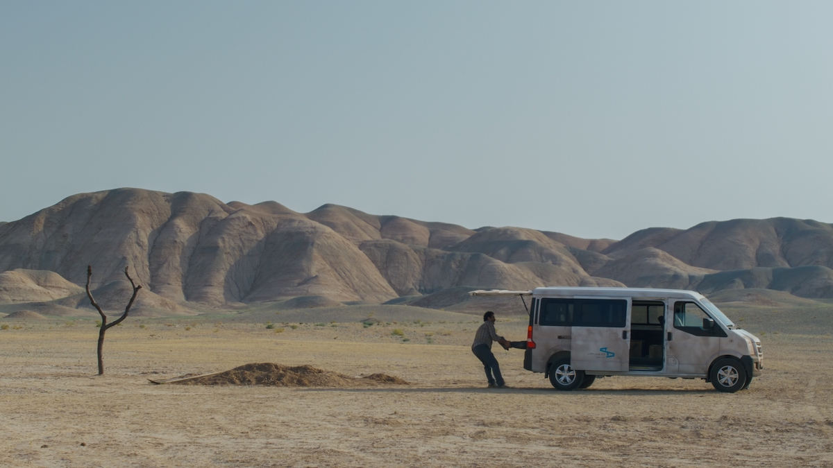 この度解禁されるシーン写真は9点。ワゴン車を荒野に停め、人間の足を掴んで穴へ無理やり放り込もうと奮闘するワヒドの姿や、過去様々な理由によって拘束や拷問された人々が、その看守(だったかもしれない)の男を取り囲む様子、ほかウエディングフォトの最中にこの<珍事>に巻き込まれた新婚夫妻が何かを真剣に話し合う様子など、いずれも、パナヒ流<前代未聞の復讐劇>の一幕を捉えたものとなっている。