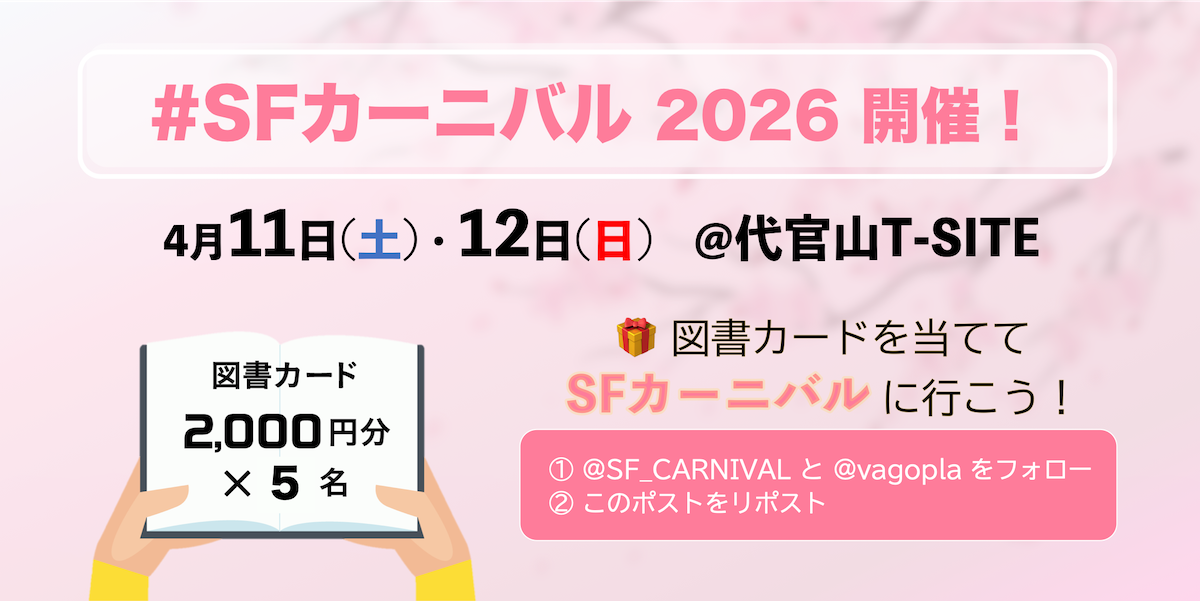 この度、SFカーニバル2026の開催を記念して、図書カードが当たるプレゼントキャンペーンを実施します! SFカーニバルとバゴプラ/Kaguya BooksのX(旧Twitter)アカウントをフォローして大正ポストをリポストしていただいた方の中から抽選で、5名様に2,000円分の図書カードNXETをプレゼント! SFカーニバルが開催される代官山T-SITEでも使える図書カードをゲットしよう!