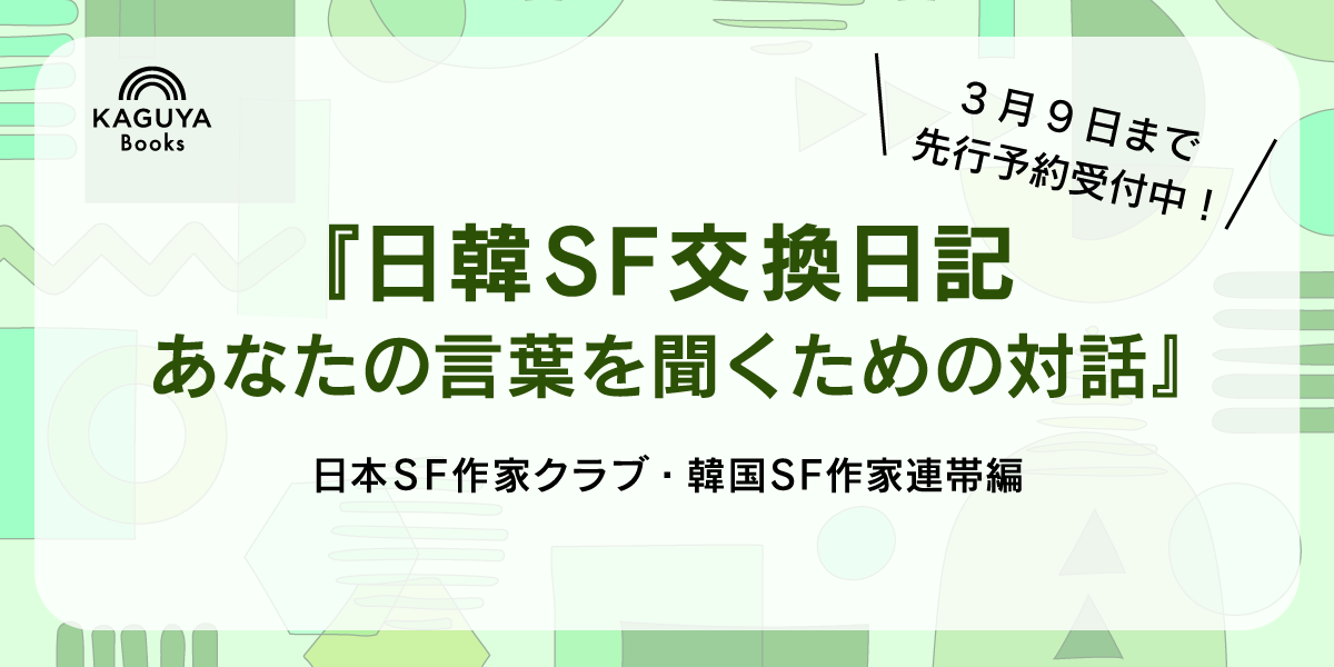 SF企業VGプラスの運営するKaguya Booksから、日本SF作家クラブ・韓国SF作家連帯編『日韓SF交換日記 あなたの言葉を聞くための対話』を2026年5月に刊行します! 3月9日まで、Kaguya Booksの公式オンラインストアで先行予約受付中! 先行予約期間にご予約いただくと、『日韓SF交換日記』をより楽しめるブックリストを特典としてお届けいたします。日本SF作家クラブ編『SF作家はこう考える 創作世界の最前線をたずねて』とのセット割も行っています。